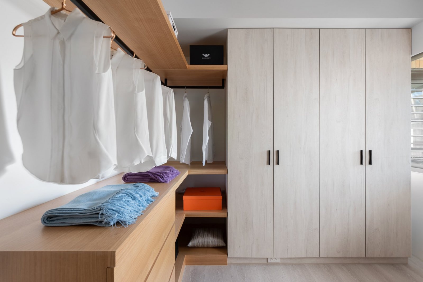 空間利用與使用比率一般有兩種,一種是建筑本身分割出來(lái)的,一種是通過(guò)自己或設(shè)計(jì)師,重新分割空間劃分出來(lái)的,實(shí)際上后者在空間上并不需要大,夠用就行。不常穿的衣物,不要占用空間,這是流動(dòng)空間的優(yōu)化體現(xiàn)。