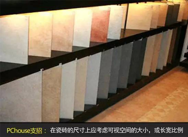 在瓷磚的尺寸上應考慮可視空間的大小,如果客廳被家具遮擋的地方多,也就是地面使用時,人的實際可視的大小,如果可視面積小的話,也應考慮用小一點規格的。又或者考慮客廳的長寬比例及大小,就效果而言,以瓷磚能全部整片鋪貼為好,就是指到邊盡量不裁磚或少裁磚,盡量的減少浪費,一般而言,瓷磚規格越大,浪費也越大。