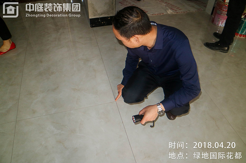 質量管理中心吳總在細心的查驗地磚鋪設平整度