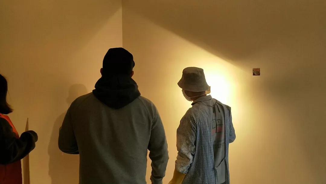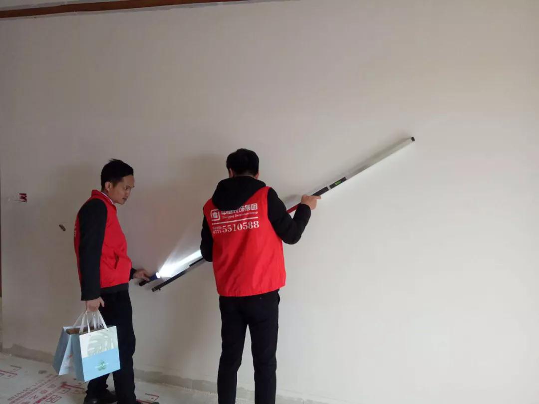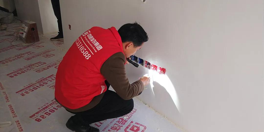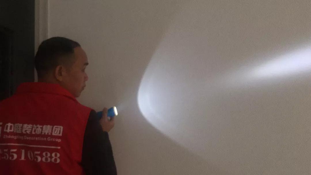 集團工程質量管理中心總監吳總用強光手電筒檢查刮膩子平整度