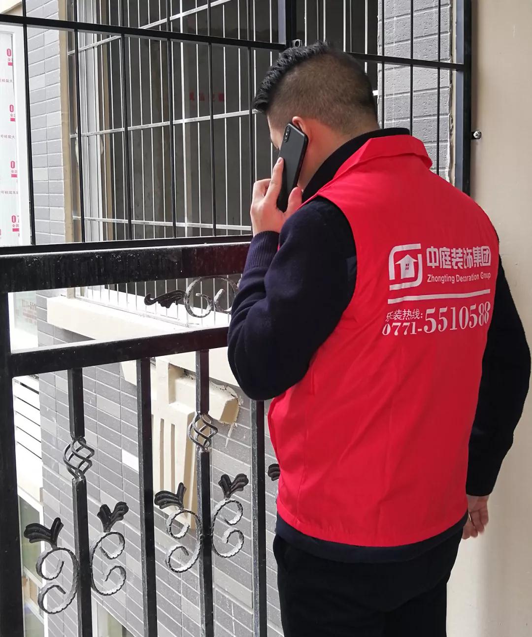 集團副總裁張總在現場電話回訪業主,同時對工地存在的一些細節問題提出解決方案。