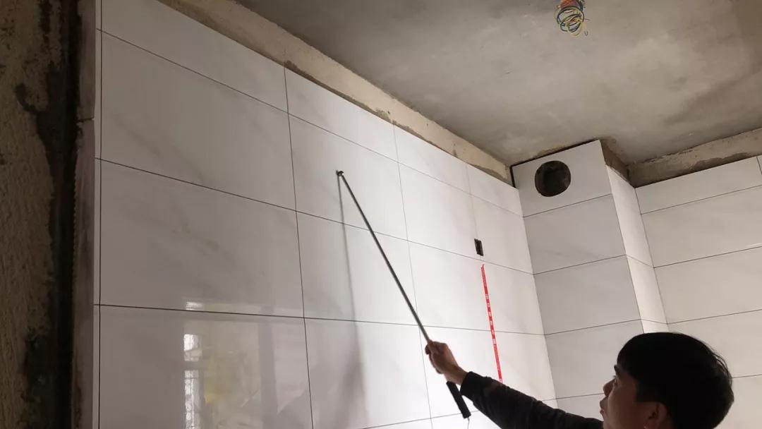 現場檢查是否按圖施工,檢查墻面鋪磚平整度