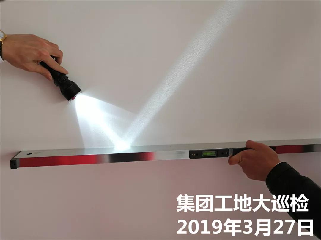 用靠尺和強光手電筒檢查墻面施工平整度,手電筒強光未能穿透墻面與靠尺間的縫隙,達到集團要求施工標準。