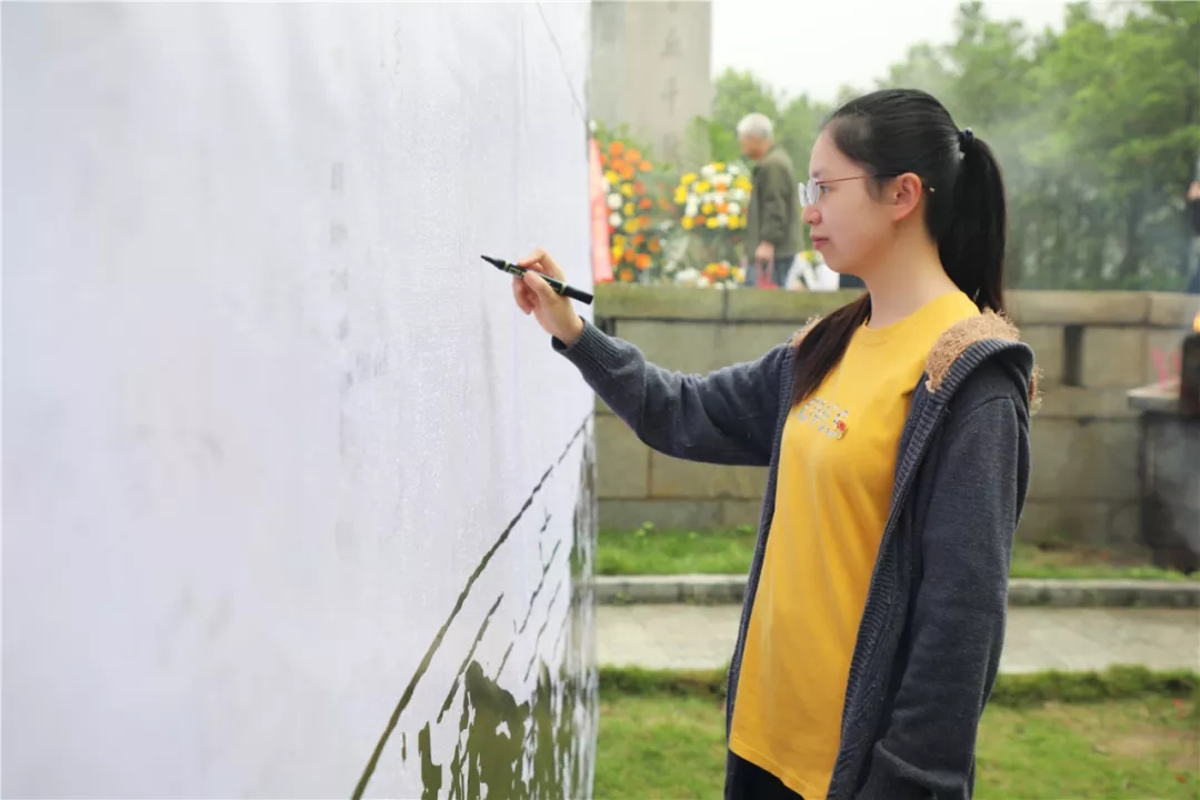 ▲黨支部代表李煥婷在烈士塔紀念墻簽字留念