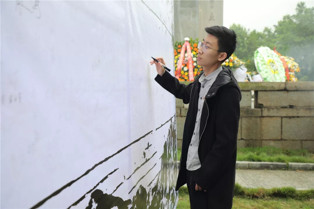 ▲黨支部代表陳夢浩在烈士塔紀念墻簽字留念