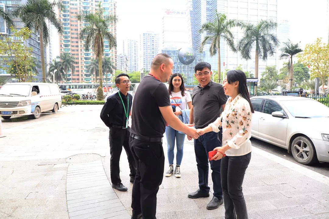 運營二部副總經理劉合波在公司大門前迎接紡織工業學校陳黔校長一行人。