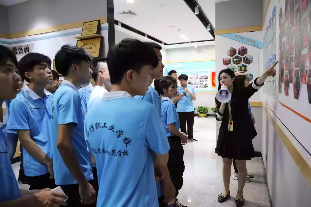 人資部經理劉高才、主管黃丹丹帶領紡織工業學校學生參觀文化長廊,向學生們介紹公司企業文化理念、組織架構、服務理念、企業榮譽、員工關懷等方面內容,讓學生們對公司的企業文化有更深的了解。