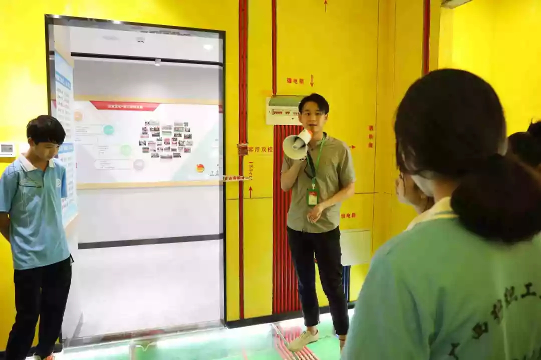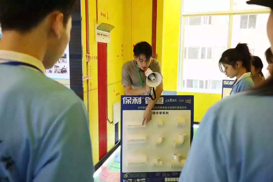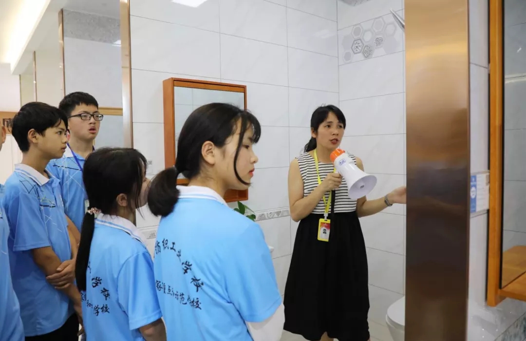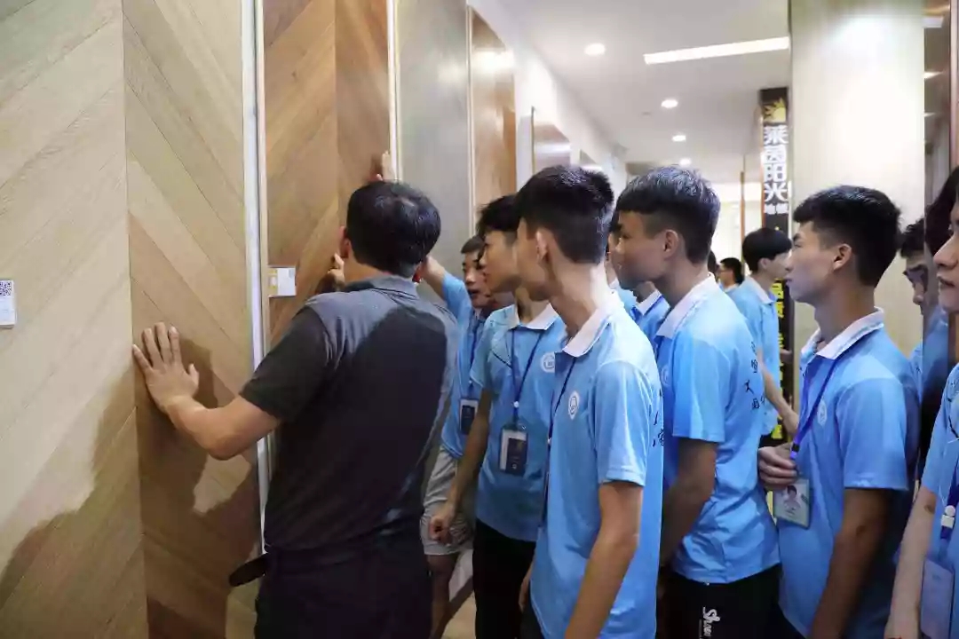 運營部設計經理韋昌豪帶領學生參觀軟裝體驗館、工藝樣板間,講解裝修設計、裝修工藝、水電工程用料方面的知識,并解答學生們的疑問。