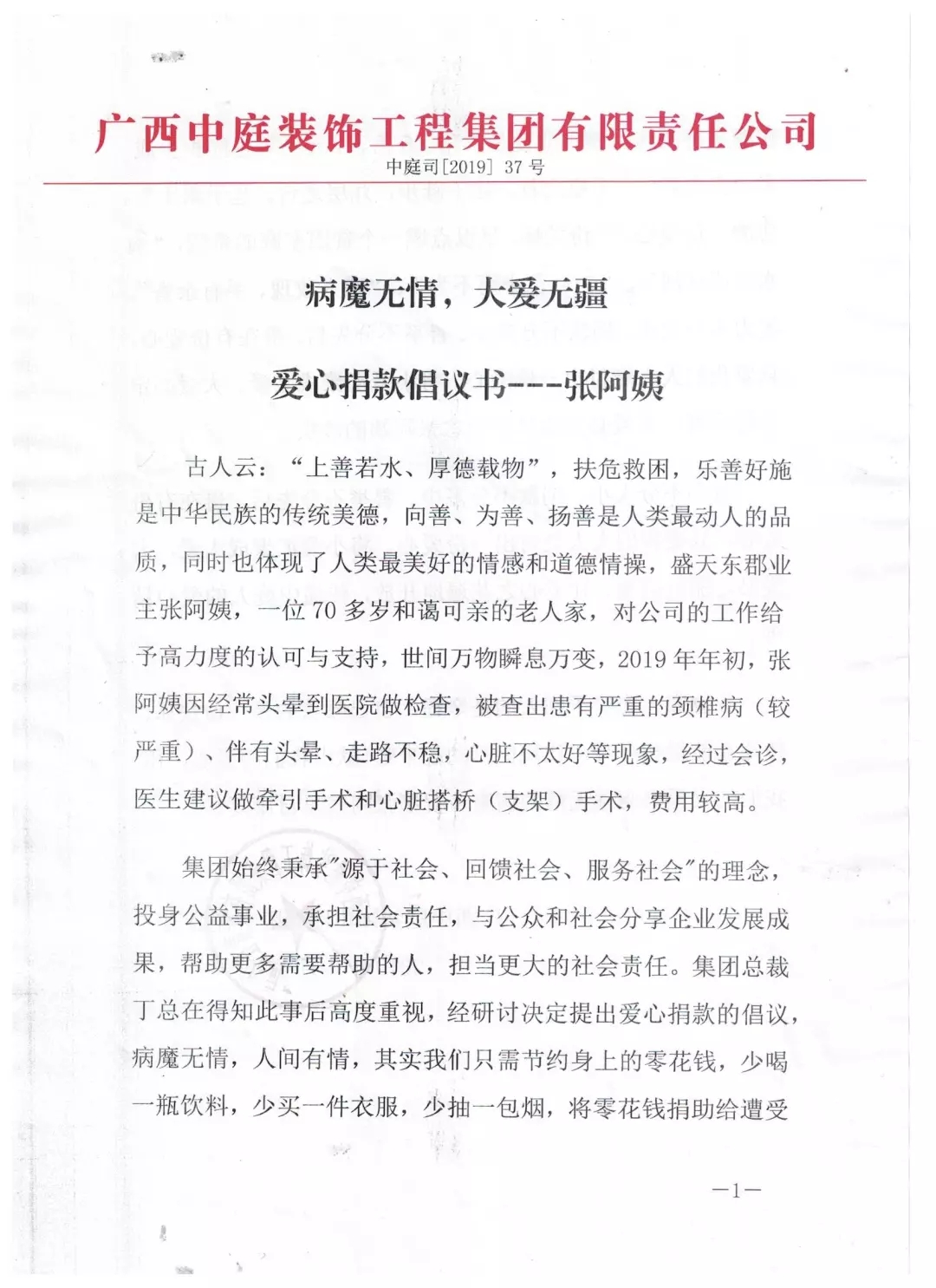 集團(tuán)總裁丁胡先生向全體員工號召,為張阿姨獻(xiàn)出一份愛心。捐款不分多少,貴在有份愛心,只要我們?nèi)巳硕寄芨冻鲆稽c(diǎn)愛、將小愛匯聚成大愛,大愛必定驅(qū)趕病魔,大愛定能早日治愈張阿姨的疾病。