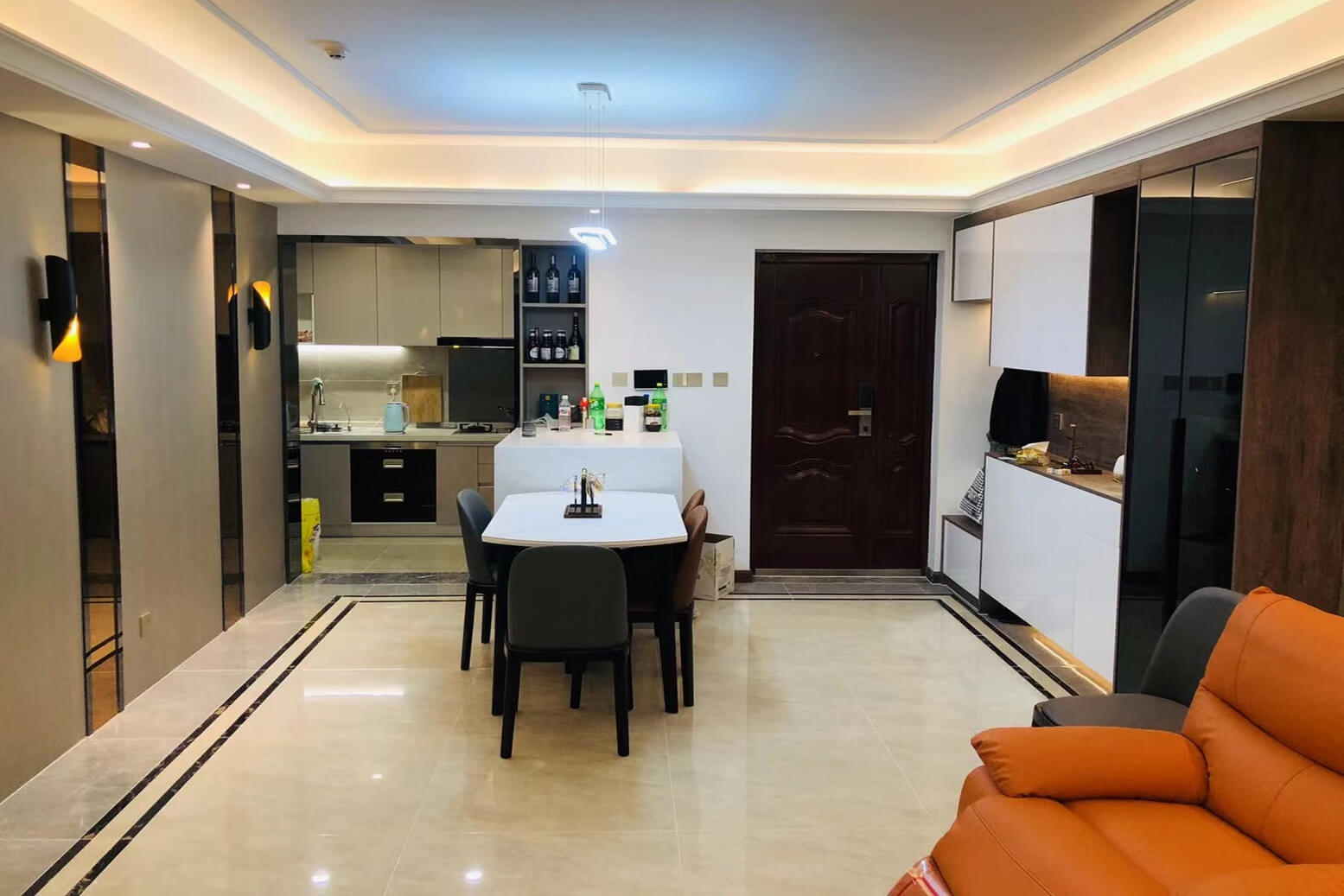 瀏覽量:344客餐廳選擇素色的木飾面顯現低調有內涵,整個客廳及餐廳的吊頂直接一體貫穿,搭配著電視背景墻長方體設計突顯空間的寬闊大氣,愛馬仕橙色的窗簾及單人沙發的呼應,增添了空間的活躍性;暖黃色燈光下白色的大理石吧臺及白色的高光柜門使得空間不再昏沉,局部黑色的鈦金夾著茶色的鏡面在大面積的素色木飾面的包裹下將現代的低調且奢華體現完美的體現了。