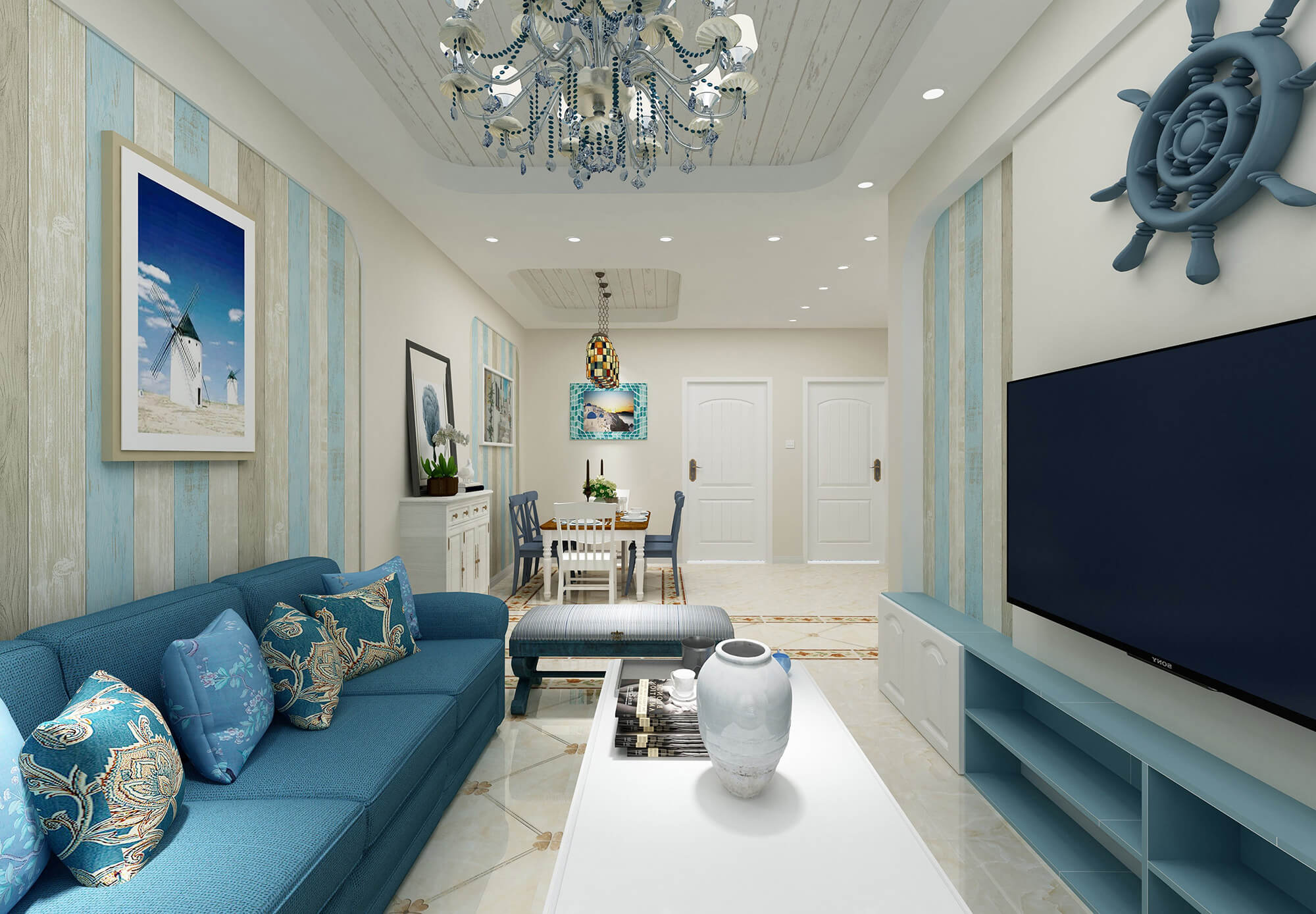 本案戶型為2房2廳1衛,總面積75㎡。現代地中海風格,打造簡約舒適的家。室內空間開敞、內外通透,打造清新、舒適的居住環境。