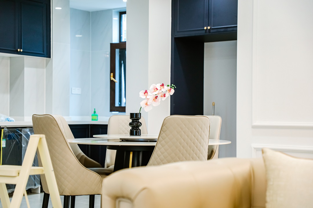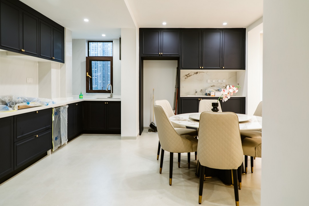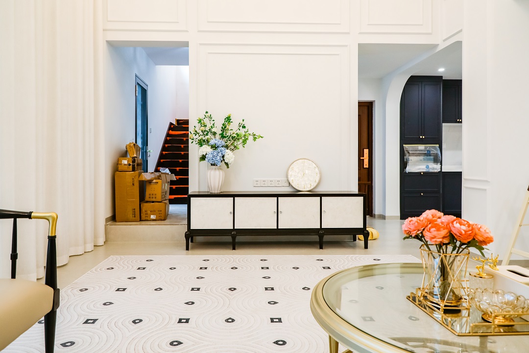 乳白色布藝沙發與黑色復古腳凳沙發的搭配,用智能窗簾隨時打開好心情,從客廳往廚房看去,用復古法式弧形帶出了精致有趣的視角