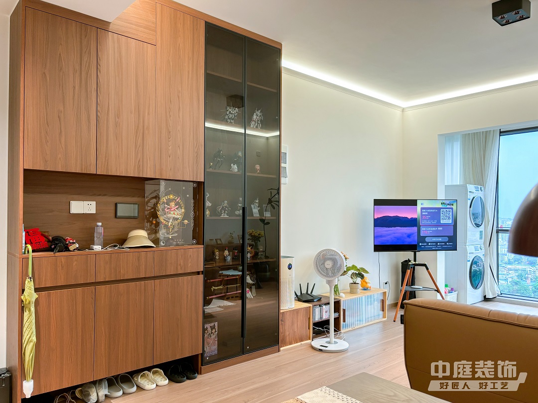 步入家門,一股清新自然的氣息撲面而來。整體空間以淺色調為主,原木色的地板與家具相互呼應,仿佛置身于北歐森林的懷抱中。大面積的玻璃窗引入自然光線,與室內溫暖的燈光交織,營造出一種溫馨而不失明亮的氛圍。