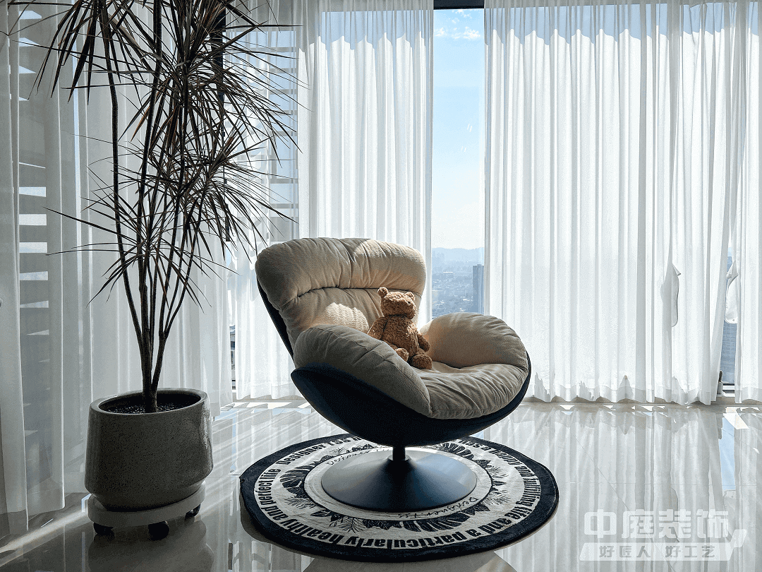陽臺:為了不浪費南面的湖景,規劃開放式陽臺,用以解決洗衣和收納雜物的問題,放上躺椅休息時直面一片風景,身心舒暢。