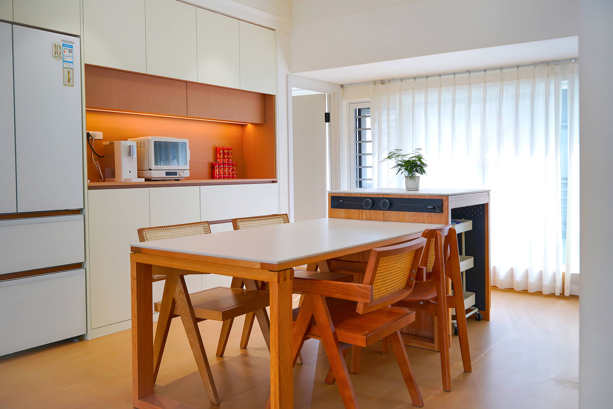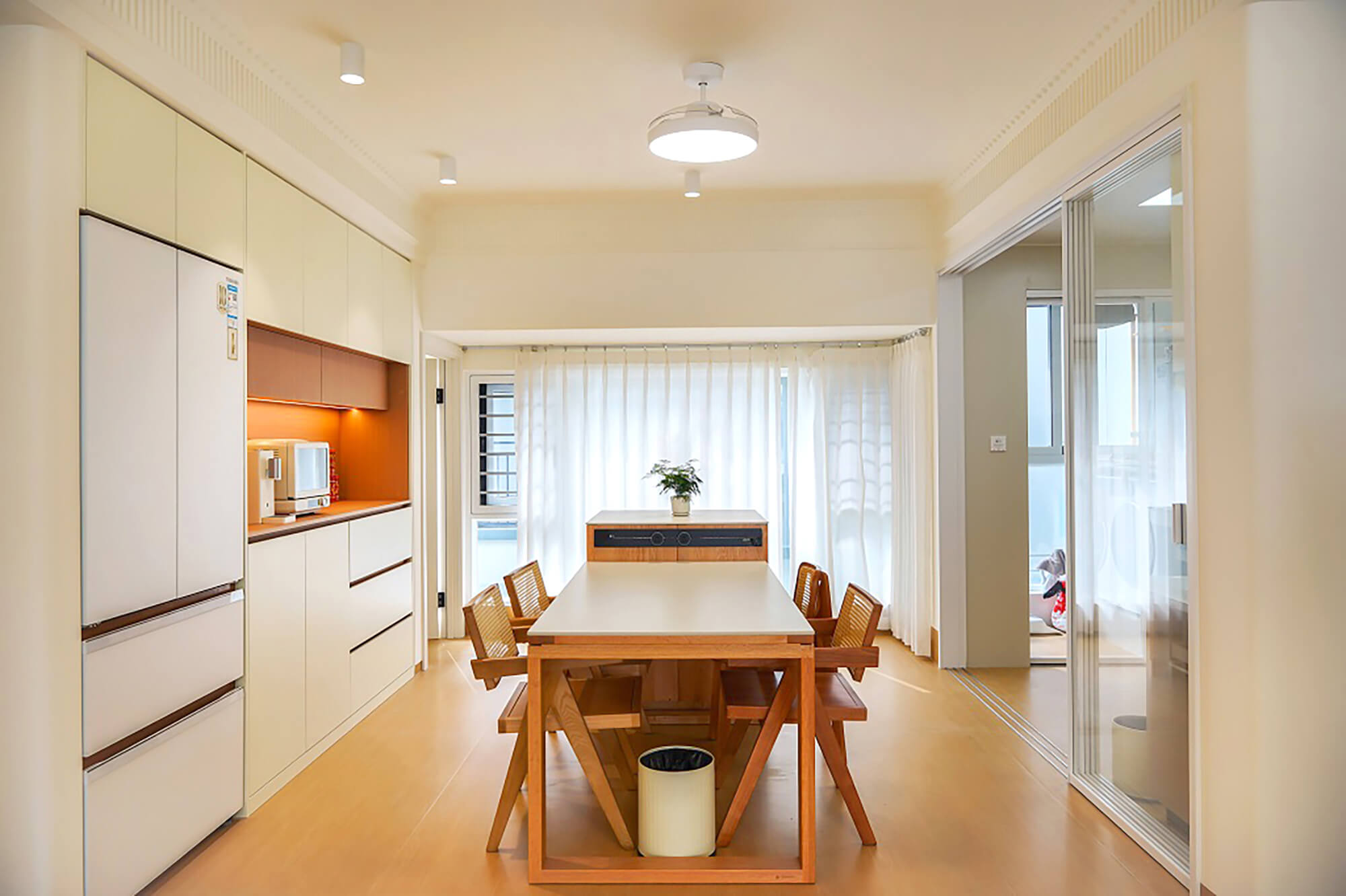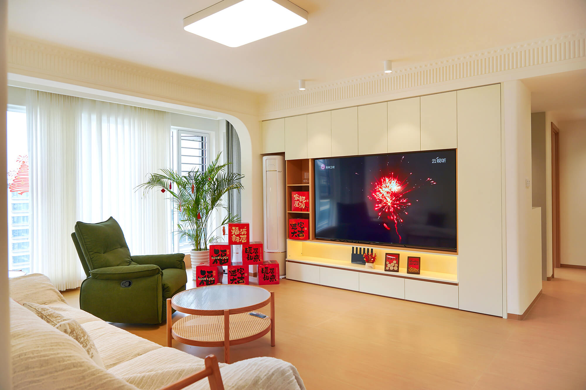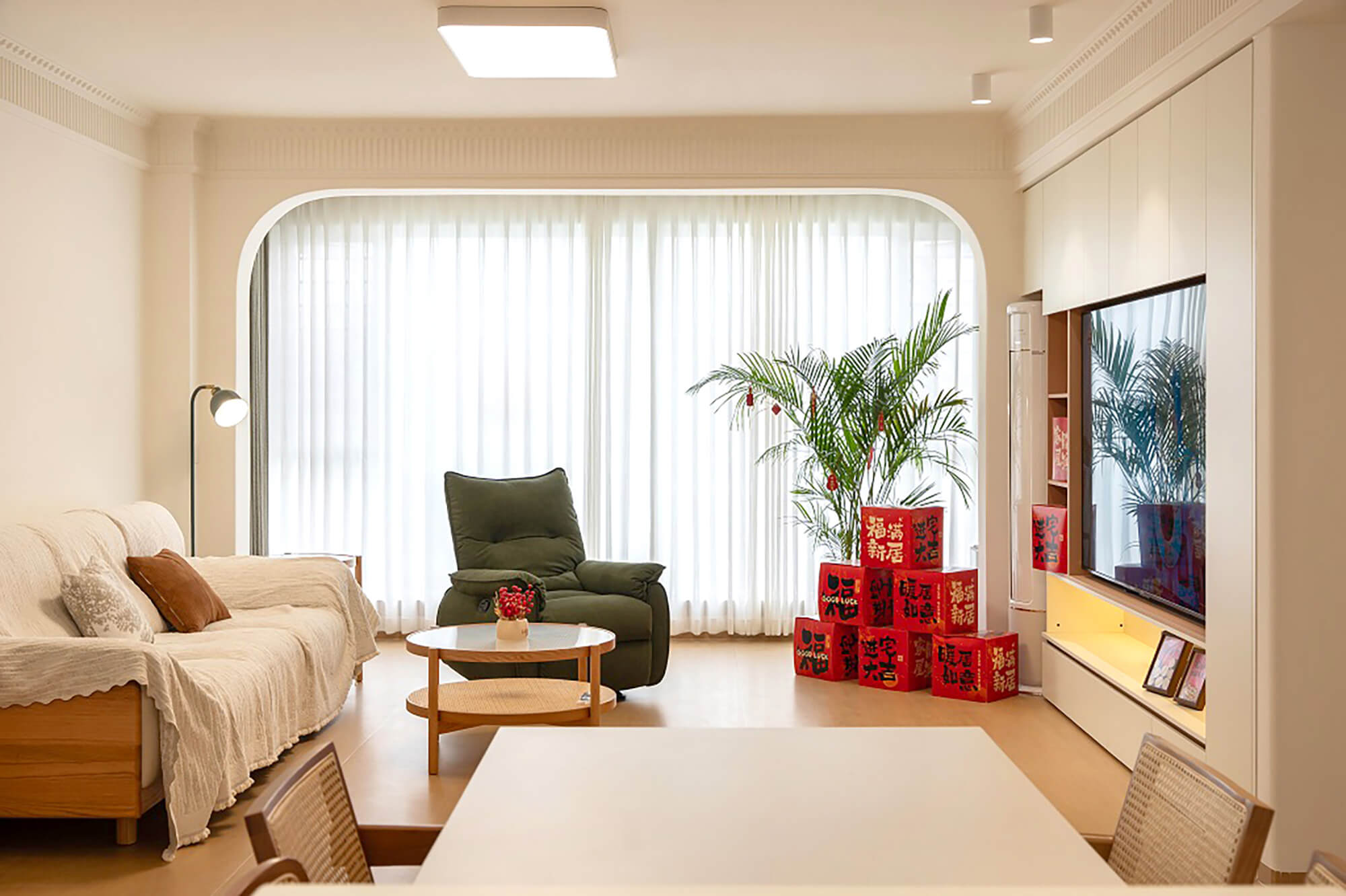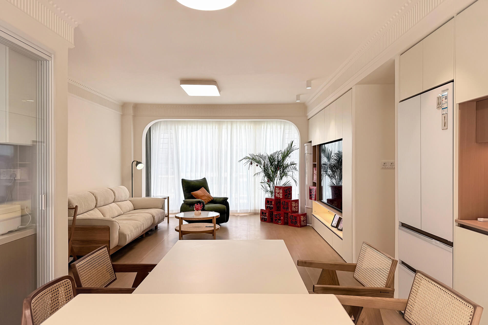 主打 “自然治愈”,以實木板材為核心元素,保留木材天然紋理與溫潤觸感。色彩以原木色為基底,搭配白、米、淺灰等柔和色調,搭配棉麻、藤編等自然材質,減少復雜造型,強調空間通透感,傳遞質樸、放松的居家氛圍。