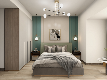 主臥的套房設計,主臥,衣帽間,書房一體化可以給業主更強的居住獨立性以及舒適感。整體延續了客廳的風格,白色與綠色之間的碰撞,與客廳互相呼應,橙色的懶人椅作為整個空間的點綴色。照明以主燈加上床兩側的吊燈做陪襯,讓整個空間顯得很有層次更有情調。